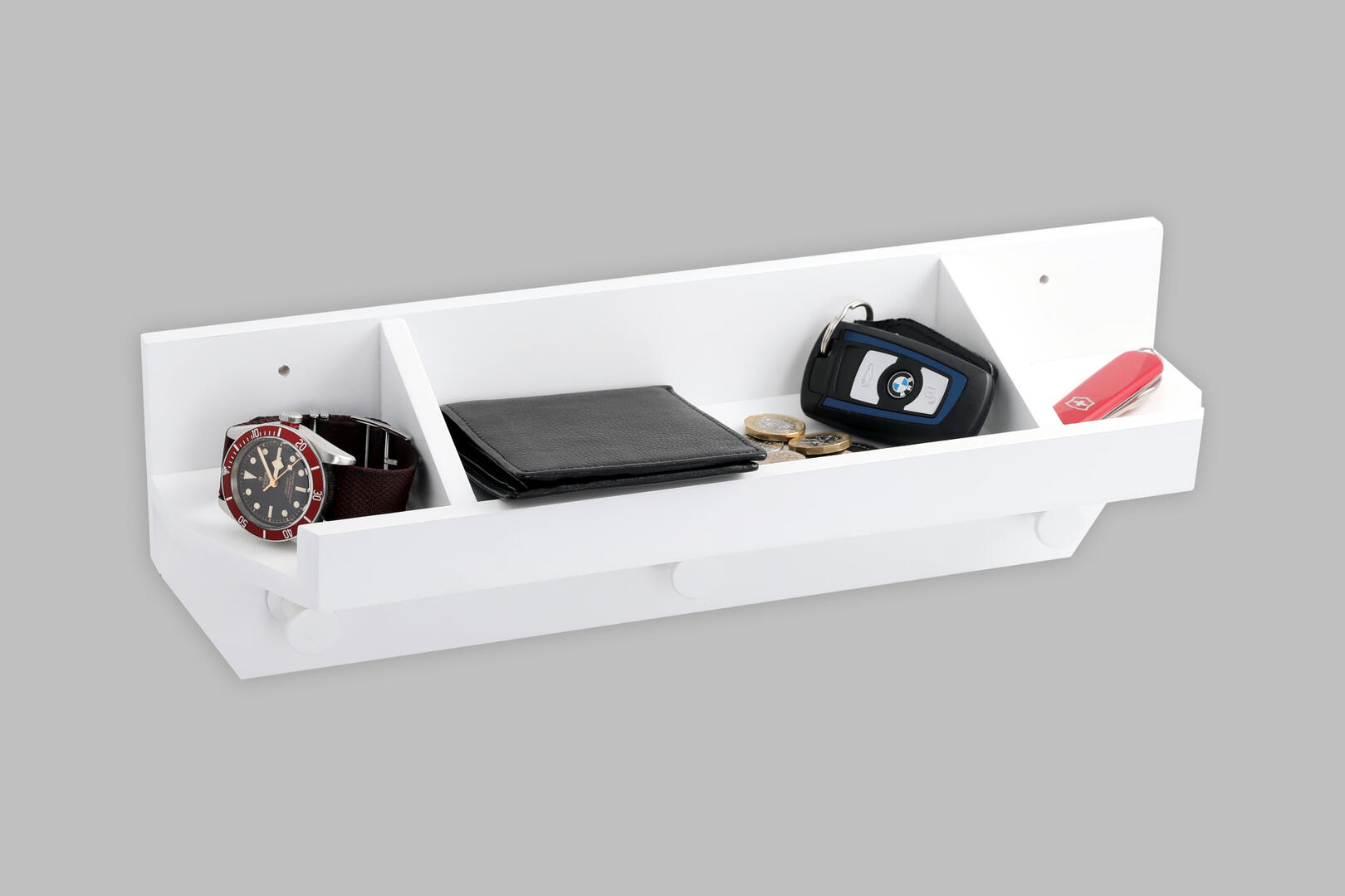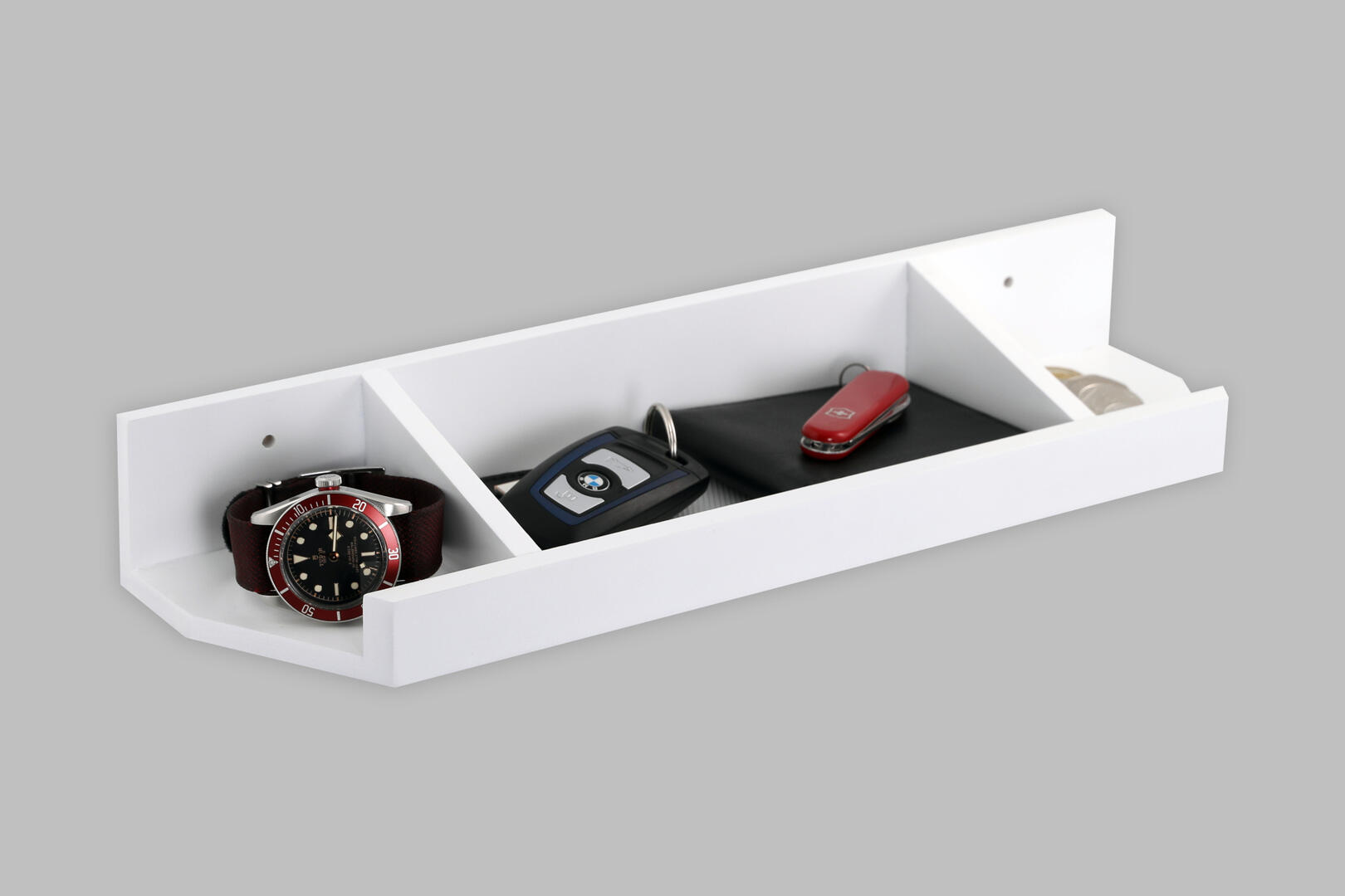 ManShelf® Original has a clean, simple yet effective design, offering three compartments; two-coin slides to the left and right, and one open area section in the middle.